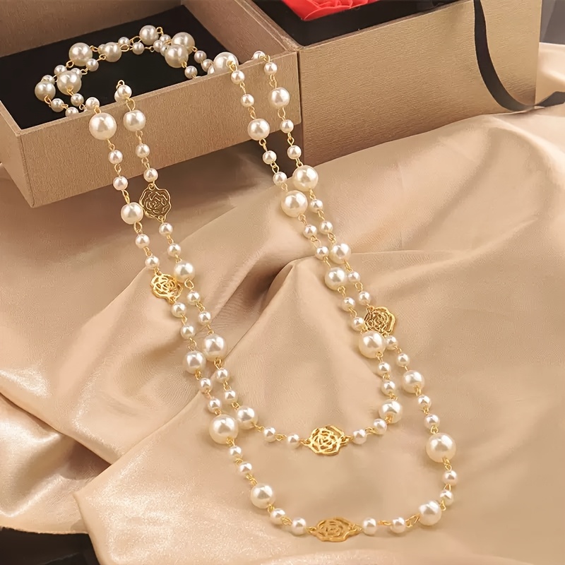 Add timeless charm to your look with this elegant layered necklace featuring imitation pearls and golden-tone floral beads. Its vintage-inspired multi-strand design makes it perfect for daily wear, parties, travel, and special occasions. A versatile piece that also makes a thoughtful gift for Valentine’s Day, graduations, or any celebration.